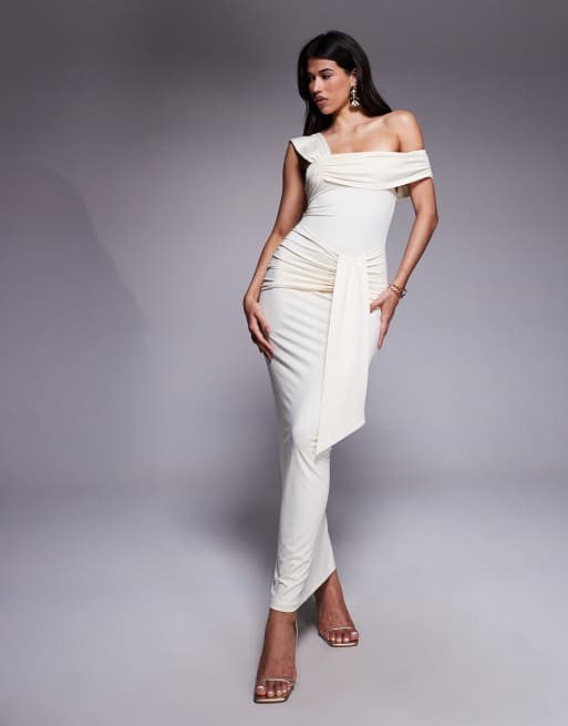 The Frolic – Exklusives, figurbetontes Maxikleid in Creme mit Bardot-Ausschnitt und drapiertem Detail