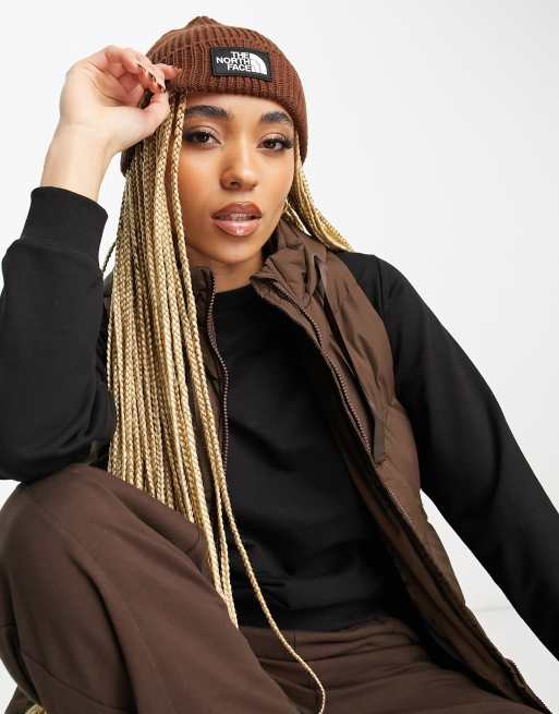 The North Face – Strickmütze in Braun mit Umschlag und TNF-Logobox
