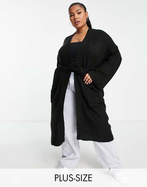 Threadbare Plus – Emerald – Maxi-Strickjacke in Schwarz mit Bindegürtel