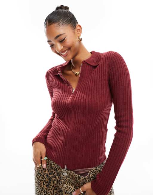 Threadbare – Figurbetonter Pullover in Burgunderrot mit durchgehendem Reißverschluss
