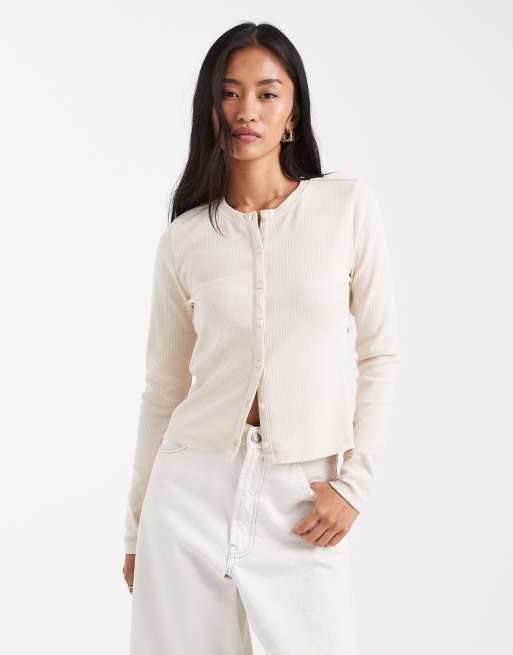 Threadbare – Langärmliges Jersey-Oberteil in Cremeweiß mit Knopfleiste