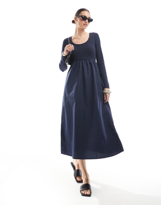 Threadbare – Langärmliges Midikleid in Marineblau aus Jersey und Popeline