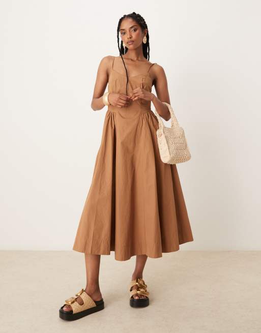Threadbare – Midikleid aus Baumwolle in Braun mit hoch angesetzter Taille