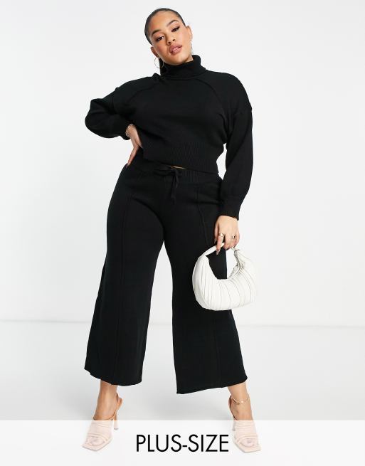 Threadbare Plus – Demetra – Strick-Set in Schwarz mit Rollkragenpullover und weiter Hose