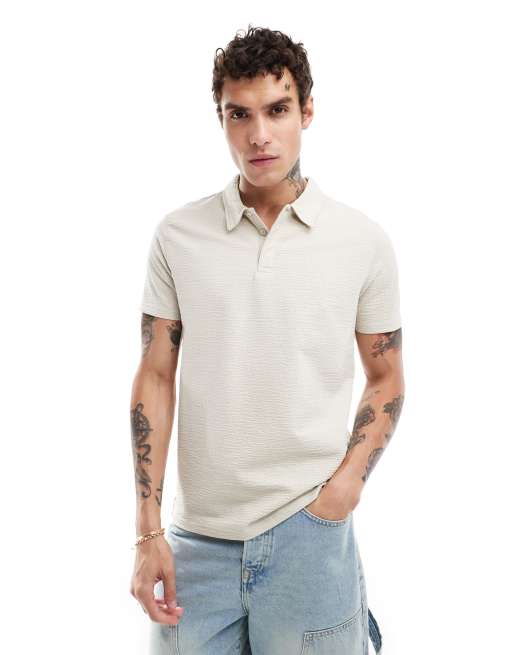 Threadbare – Seersucker-Polohemd in Grau mit bedrucktem Kragen