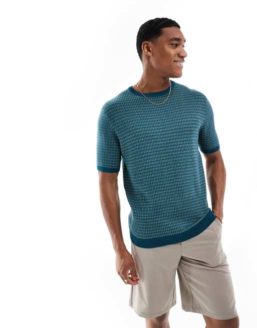 Threadbare – Strick-T-Shirt mit geometrischem Aufdruck in Blau und Ecru