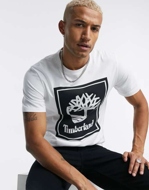 Timberland – Weißes T-Shirt mit kastigem Logo vorne