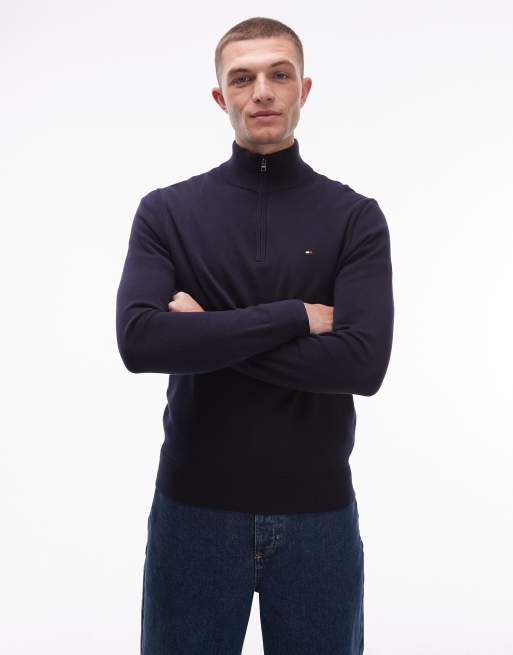 Tommy Hilfiger – Basic-Pullover aus Baumwolle in Marineblau mit kurzem Reißverschluss
