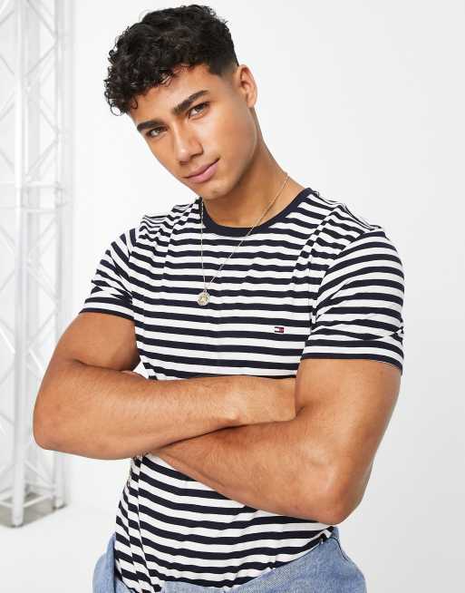 Tommy Hilfiger – Gestreiftes, schmales Stretch-T-Shirt aus Baumwolle in Marineblau mit Markenlogo - NAVY