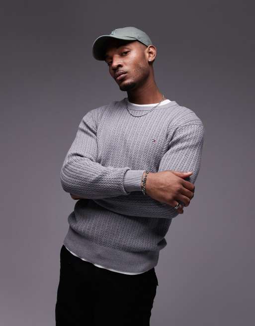 Tommy Hilfiger – Strickpullover in Grau mit Fischgrätmuster und Rundhalsausschnitt