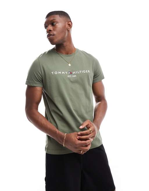 Tommy Hilfiger – T-Shirt in Khaki-Grün mit Logo
