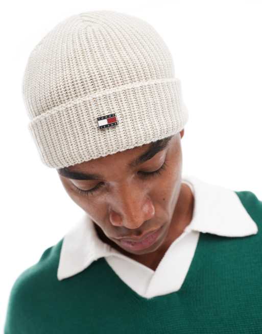 Tommy Jeans – Gerippte Strickmütze in Wollweiß mit Flaggen-Logo