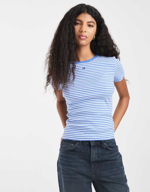 Tommy Jeans – Geripptes Basic-T-Shirt in gestreiftem Blau mit Slim-Fit