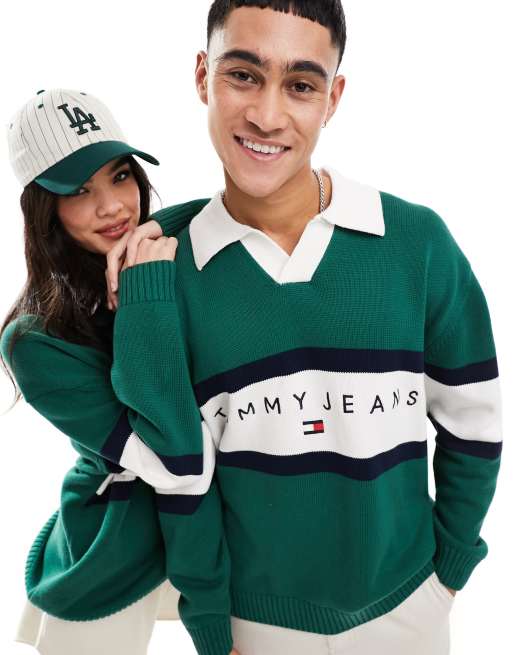 Tommy Jeans – Gestricktes Unisex-Rugby-Hemd in Grün mit lockerem Schnitt und V-Ausschnitt mit Umlegekragen