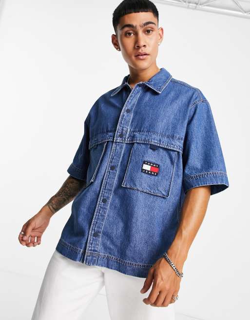 Tommy Jeans – Jeans-Hemdjacke im Arbeiterstil in Indigoblau mit Flaggenlogo und halblangen Ärmeln