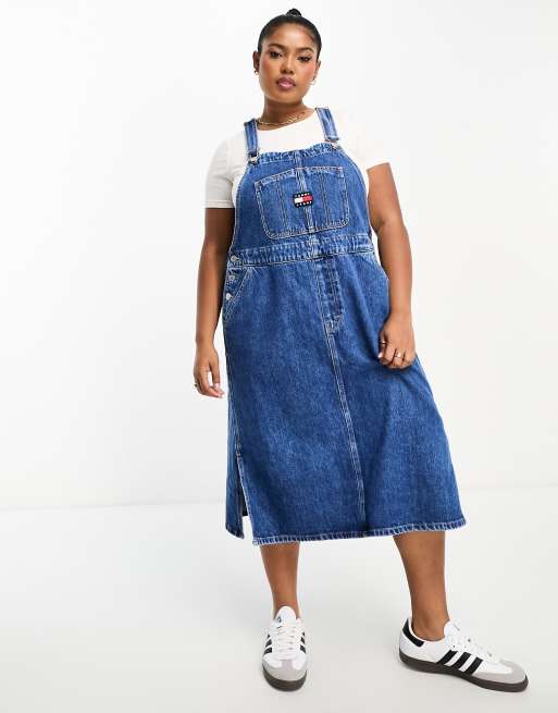 Tommy Jeans Plus – Jeans-Latzkleid in Midilänge in mittlerer Waschung