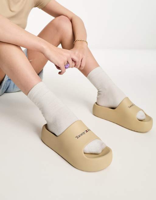 Tommy Jeans – Slider in Beige mit linearem Logo und flacher Plateausohle