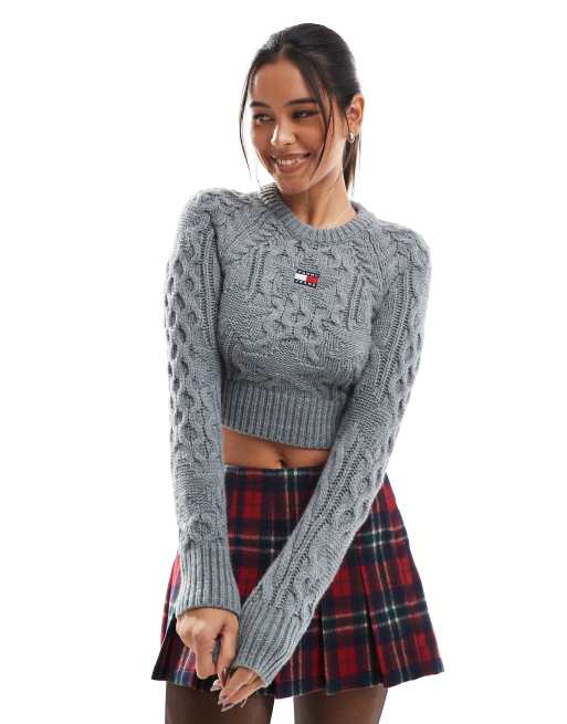 Tommy Jeans – Strickpullover in Hellgrau mit Zopfmuster und Sterndetail