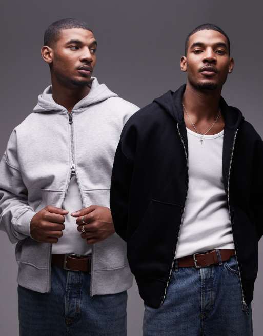 Topman – 2er-Pack hochwertige, schwere Kapuzenjacken in Schwarz und meliertem Grau mit lockerem Schnitt und Reißverschluss