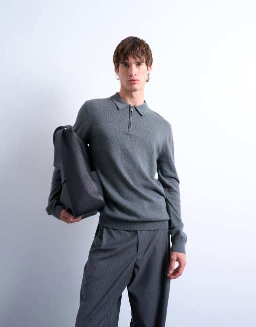 Topman – Essential – Gestricktes Polohemd in Anthrazit mit Reißverschluss