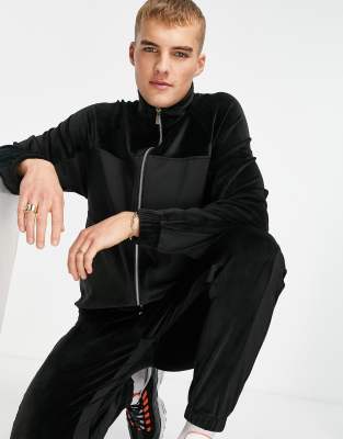 Topman – Gefütterte Trainingsjacke aus Velours mit Farbblockdesign in Schwarz, Reißverschluss und Stehkragen, Kombiteil
