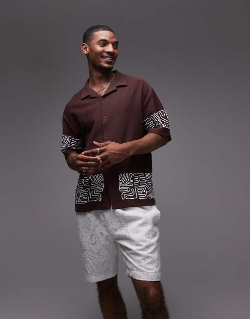 Topman – Geknöpftes Relaxed-Fit-Hemd aus strukturiertem Jersey in Braun mit geometrischer Kordelstickerei