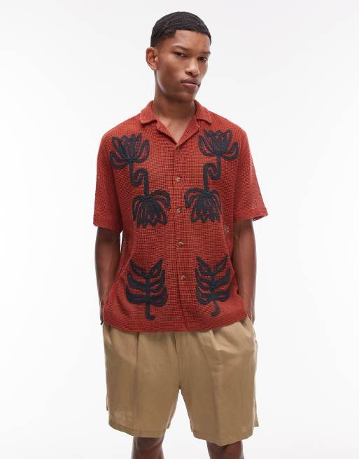 Topman – Kurzärmliges Häkel-Hemd in Rostrot mit Kordeldetails