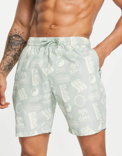 Topman – Lang geschnittene, bedruckte Badeshorts in Mintgrün