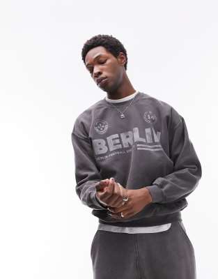 Topman – Oversize-Sweatshirt in verwaschenem Schwarz mit „Berlin“-Print