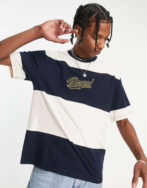 Topman – Oversize-T-Shirt in Marineblau mit breitem Streifenmuster und Stickerei