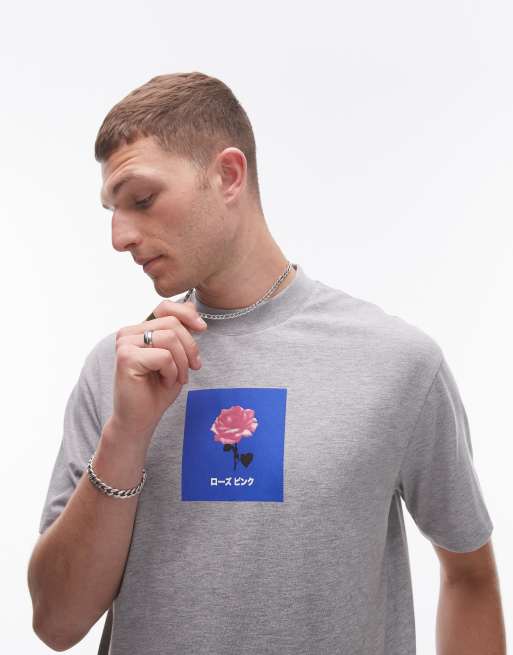 Topman – Oversized-T-Shirt in Grau meliert mit japanischem Blumenmuster