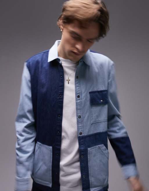 Topman – Patchwork-Hemdjacke in blauen Jeanstönen