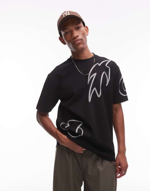 Topman – Premium – Relaxed-Fit-T-Shirt in Schwarz mit abstrakter Kordelstickerei vorne und hinten