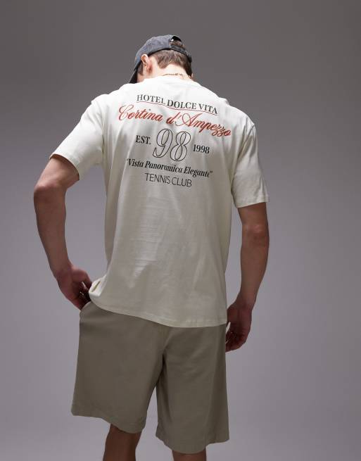 Topman – Relaxed-Fit-T-Shirt in Ecru mit „Hotel Dolce Vita“-Print auf Vorder- und Rückseite