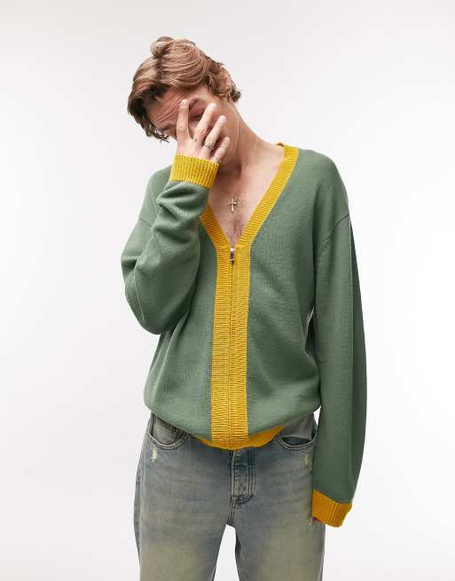 Topman – Strickjacke in Salbeigrün mit Reißverschluss und Kontrast