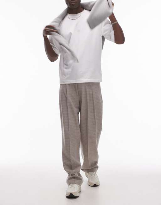 Topman – Strukturierte Anzughose in Steinbeige mit weitem Bein
