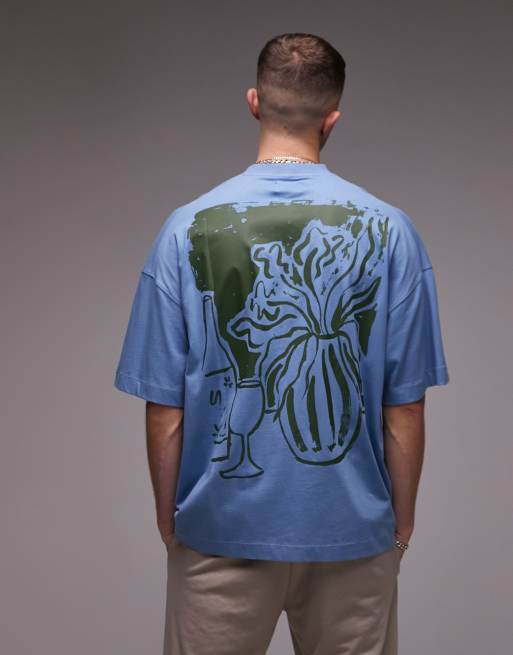 Topman – Super-Oversize-T-Shirt in Blau mit Stilleben-Aufdruck auf Vorder- und Rückseite