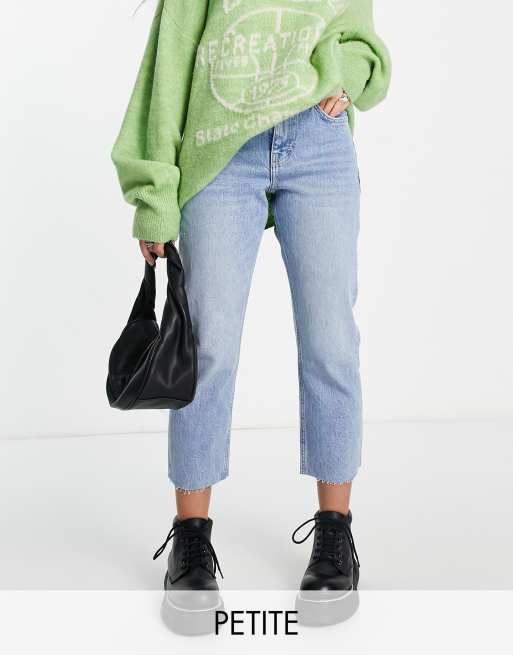 Topshop Petite – Gerade Jeans in Mittelblau mit mittelhohem Bund, verkürzter Beinlänge und unversäubertem Saum