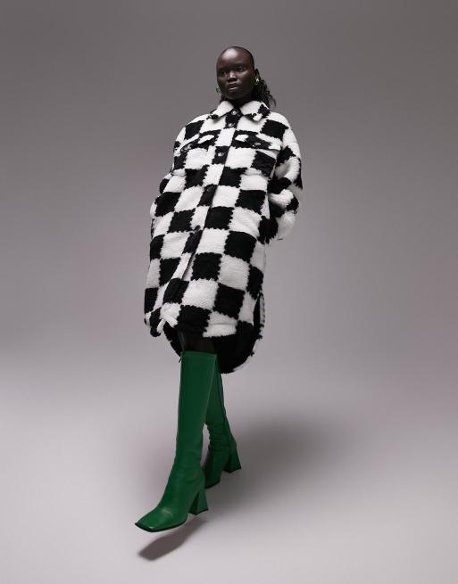Topshop Petite – lang geschnittene Jacke aus Kunstpelz mit Schachbrettmuster in Schwarz-Weiß