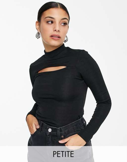 Topshop Petite – Langärmliges Satin-Oberteil mit Zierausschnitt in Schwarz