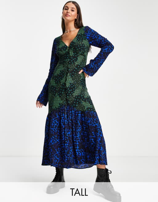 Topshop Tall – Mehrfarbiges Midikleid aus Viskose-Mischung mit V-Ausschnitt und Mustermix - MULTI