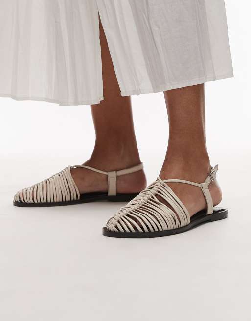 Topshop – Aidan – Flache Leder-Schnürschuhe in Wollweiß mit Webstruktur