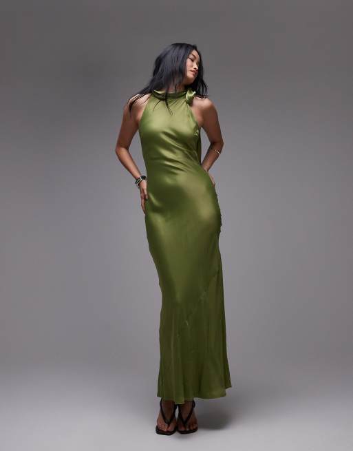 Topshop – Ärmelloses Satin-Kleid in Grün mit Schleife am Ausschnitt und Schrägschnitt