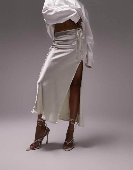 Topshop – Asymmetrischer Midirock in Champagner mit Schlitz und Bindedetail