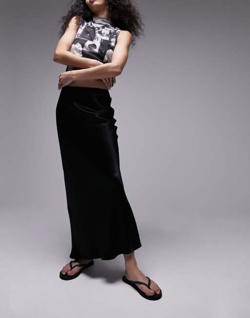 Topshop – Asymmetrischer Satin-Midirock in Schwarz