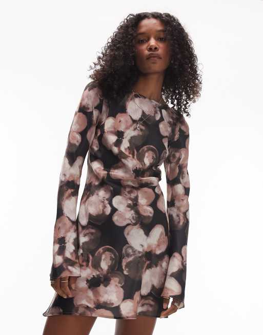 Topshop – Asymmetrisches Mini-Freizeitkleid in Braun mit Blumenmuster und ausgestellten Ärmeln