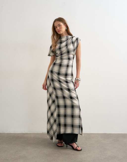 Topshop – Asymmetrisches, seitlich gestecktes Maxikleid mit schwarzweißem Karomuster