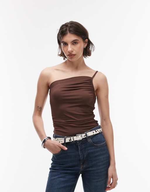 Topshop – Asymmetrisches Träger-Top aus Jersey in Braun