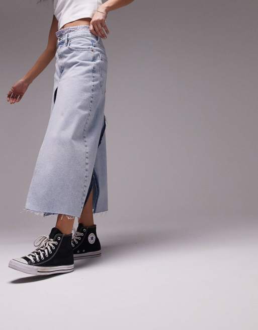 Topshop – Ausgeblichener, dekonstruierter Jeansrock mit Popeline-Einsatz