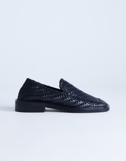 Topshop – Bali – Flache Loafer aus echtem Leder in Schwarz mit Webdesign